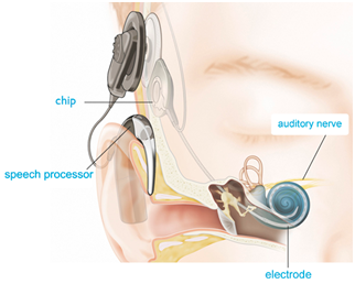 Cochlear implants are prosthetic devices that provide hearing for persons with severe to profound hearing loss who receive little or no benefit from hearing aids. Tiny wires (electrodes) are surgically inserted into the cochlea (an organ of hearing). The cochlear implant converts sound energy into electrical signals and stimulates the auditory nerve.